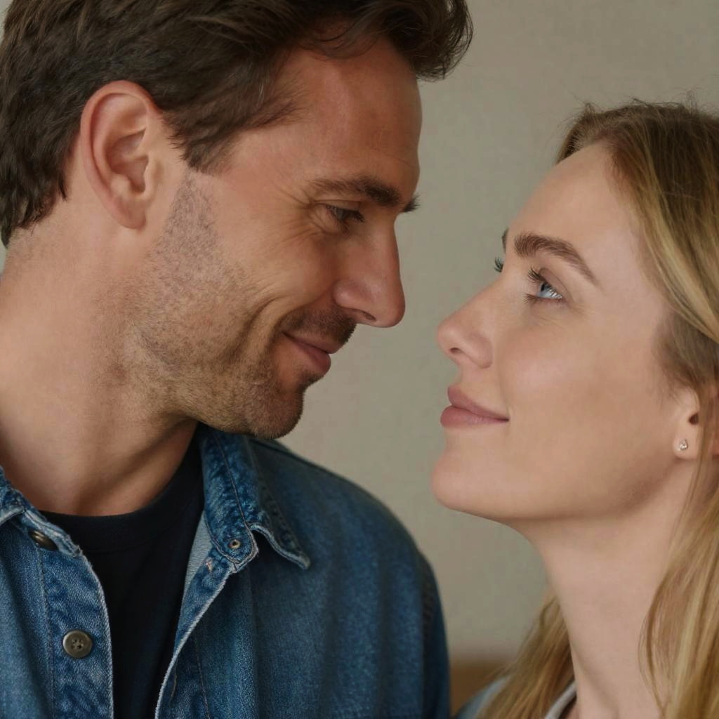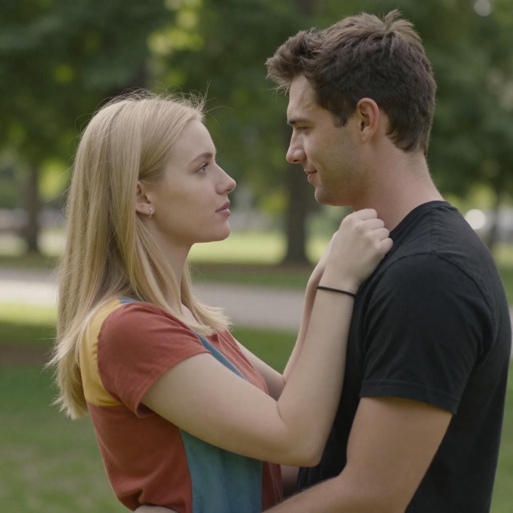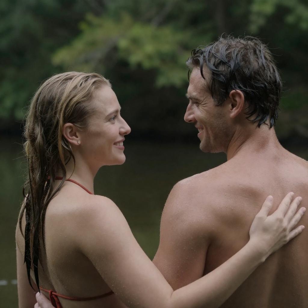 A smiling man and woman with wet hair and skin standing close together in a forest lake. The woman with blonde hair and red swimsuit strap has her right arm resting on the man's left shoulder. The man with dark brown hair looks at her fondly. The background features green foliage, suggesting a natural outdoor setting.