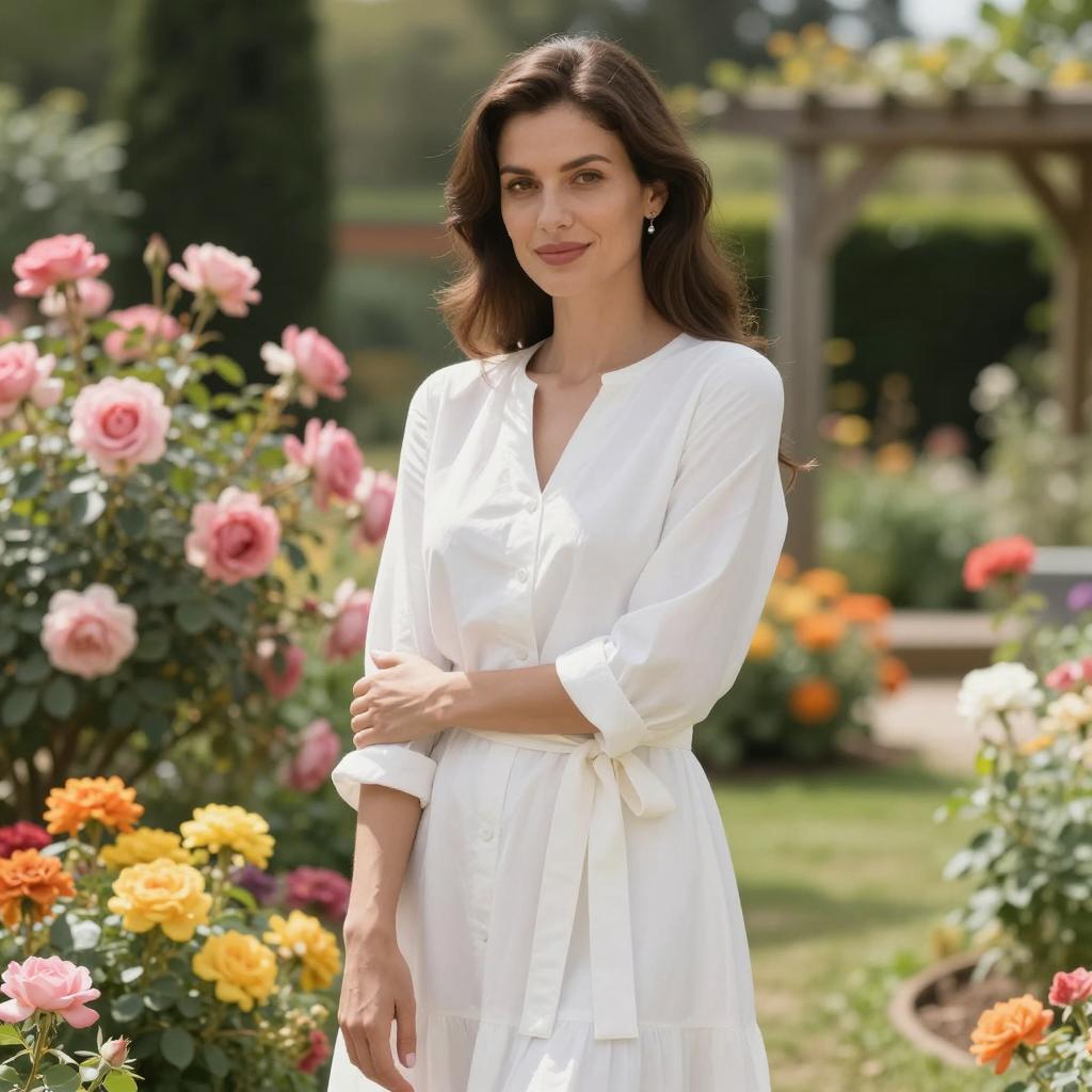 Indigo blue dress, photograph of a beautiful woman with long wavy brown hair, wearing a dark blue long-sleeve dress, standing in a colorful flower field, bright sunlight, soft focus background, natural makeup, serious expression, bokeh effect, daytime, spring season, floral garden