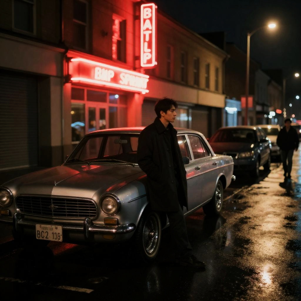 Nighttime photograph of a city street. Man in dark coat stands beside a silver vintage car, illuminated by red neon lights from a building. Buildings with neon signs, parked cars, and streetlights. Wet pavement reflects lights. Two people walking in the background.