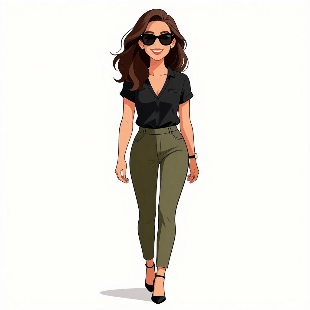 Woman with pretty face and pretty hair. smiling Woman, chic, black V-neck blouse with short sleeves, front pocket detail, tucked into slim-fit olive trousers, high-waisted, ankle-length with seam detail, black strappy high heels, oversized black sunglasses, classic watch on wrist. --sref 1467