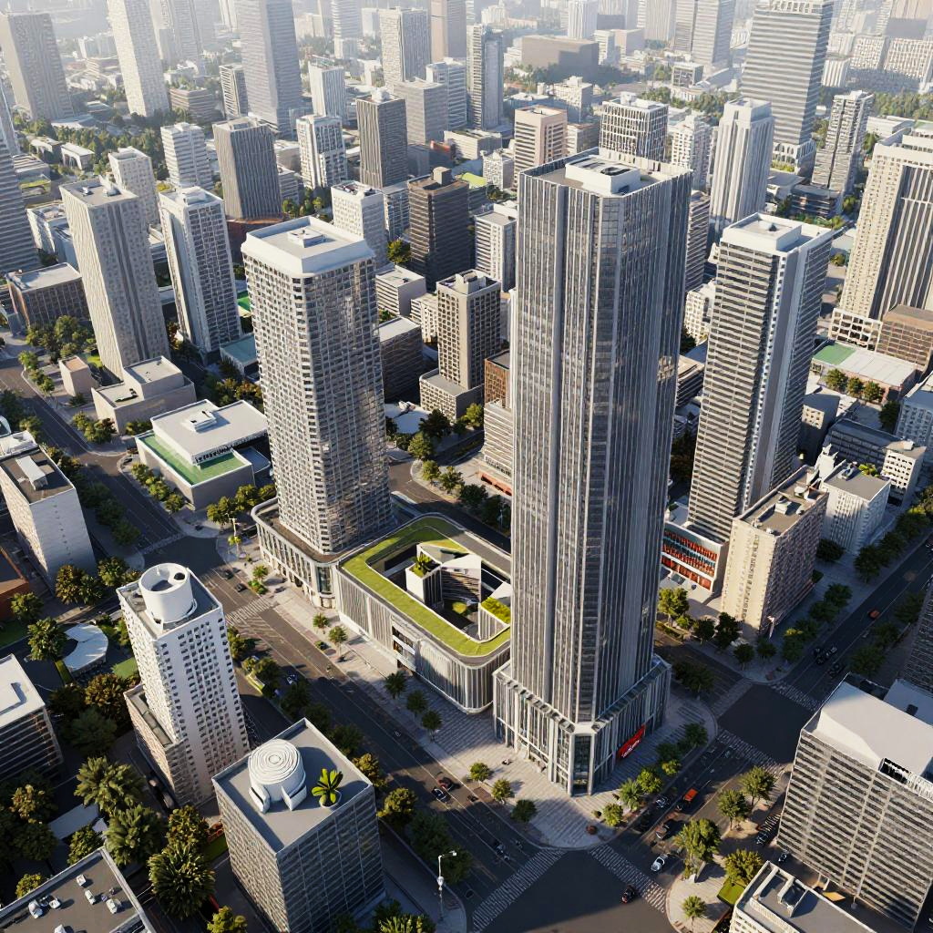 A high-resolution aerial view of a modern megacity featuring a central urban axis lined with tall skyscrapers and lush greenery. The clear day highlights the glass facades of towering buildings, palm trees flanking the main road, and a well-planned intersection with light traffic. The scene showcases contemporary architecture and urban planning with a vibrant, clean city atmosphere.