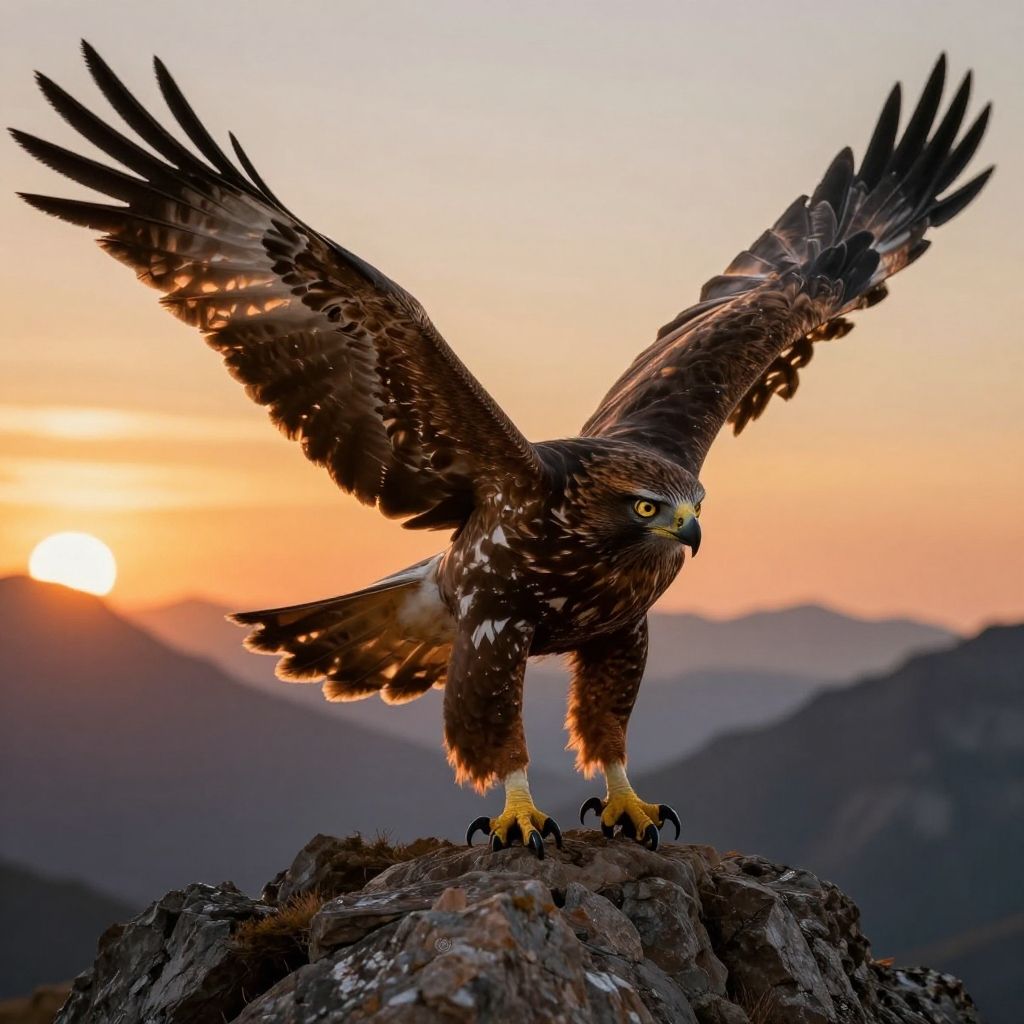 Photograph of a majestic hawk with dark brown and white speckled feathers, yellow eyes, and sharp yellow talons, standing on a rocky peak with wings fully extended. The hawk's feathers are detailed with a textured pattern. The background features a serene sunset with a gradient sky of orange, pink, and purple, and silhouetted mountain ranges. The sun is partially visible on the left, casting a warm glow. The hawk's intense gaze and powerful stance dominate the composition, creating a dramatic and dynamic scene.