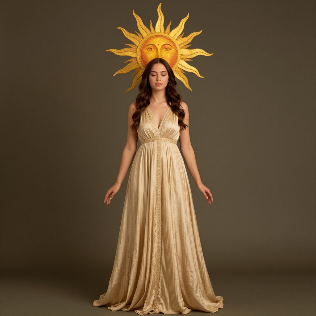 "Sun Goddess Dress, image of a woman in a dress with a sun on her head"