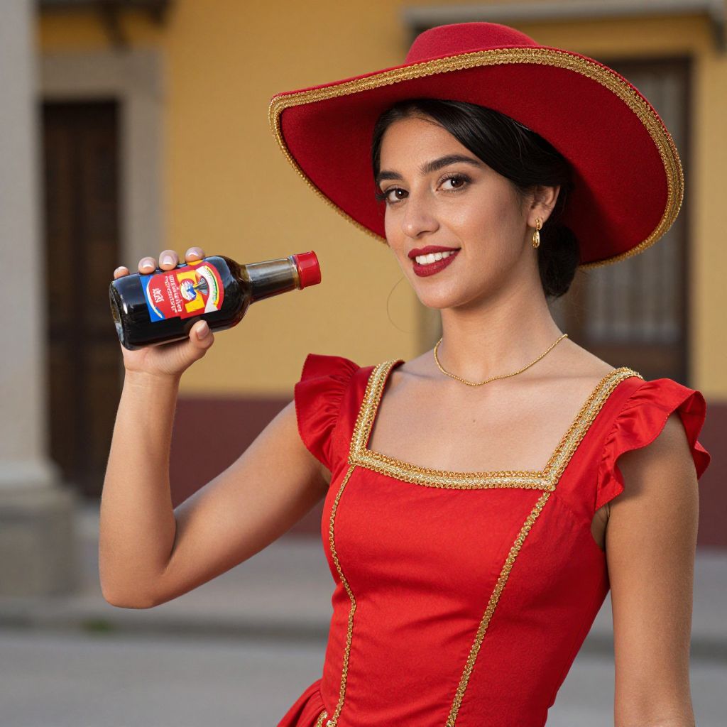 Spanish Dressing, woman in red dress with gold trim and red hat