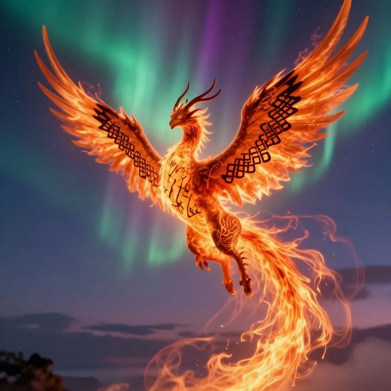 A majestic mythical creature emerges from swirling flames and smoke, soaring into a twilight sky adorned with vibrant auroras. This digital art piece masterfully combines elements of Eastern and Western aesthetics, integrating traditional calligraphy with intricate knot patterns on its ethereal wings and tail. The scene is captured from an unusual perspective, as if viewed by a microscopic insect hovering near the creature's majestic plumes, evoking a sense of intimacy and wonder. The artwork beautifully encapsulates the transient nature of life while celebrating the indomitable spirit that defines our existence, inviting viewers to reflect on these profound themes.