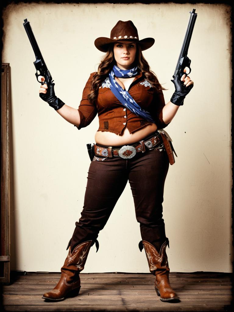 Full-body portrait of a plus size woman dressed in a brown cowgirl costume. She is wearing a cowboy hat, cropped brown shirt, brown pants, and cowboy boots. The outfit is accessorized with a blue bandana, black gloves, and a decorative belt with a holster. She holds two revolvers, standing confidently against a plain background.