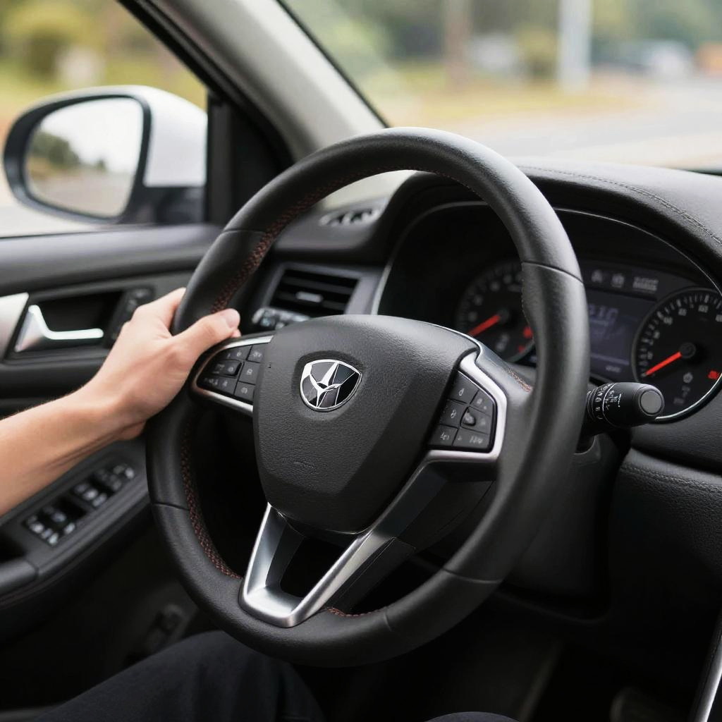 Photograph of a car's interior focusing on a black, leather-wrapped steering wheel with a silver Honda logo in the center. A light-skinned hand grips the wheel's lower left. The background shows a blurred view of greenery and a white car outside the driver's side window. The dashboard features black and silver accents, with a digital speedometer and red needle visible on the right. The image has a realistic, high-definition style, capturing the textures of the leather and the modern car design.