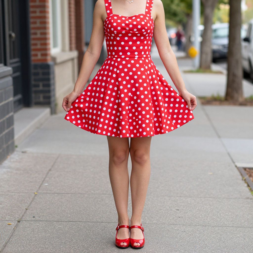 Photograph of a woman in a red polka dot dress, red Mary Janes, standing on a sidewalk, flaring her skirt, with blurred