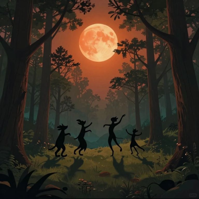 This digital illustration depicts a dark, enchanted forest at night under a large, glowing full moon. Silhouetted against the moonlight are four whimsical, anthropomorphic figures with pointed ears and hats, dancing joyfully on a grassy clearing. Tall trees with dense foliage frame the scene on both sides, while the background fades into a misty, shadowy forest. The moon's red-orange glow casts long shadows of the dancers and trees, creating a magical, mysterious atmosphere. The color palette includes deep blacks, rich greens, and vibrant reds, enhancing the fantasy-like quality of the illustration.