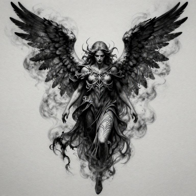 Angel of death tattoo drawings featuring a dark, ethereal figure with large, detailed wings engulfed in mist, intricate gothic patterns, and sharp, shadowy contrasts, designed in black and gray ink style for a dramatic and haunting look.