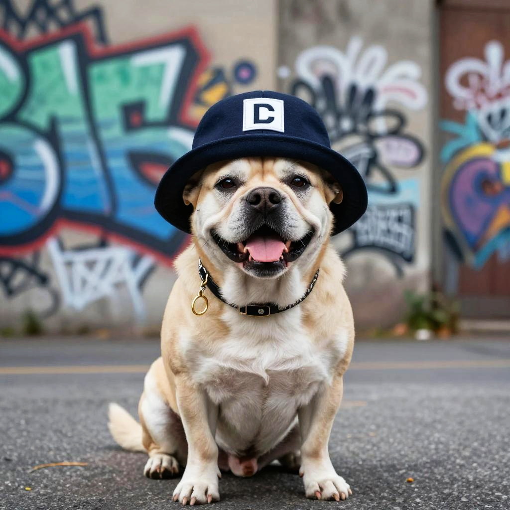 Photograph of a tan bulldog sitting on a street, wearing a black hat with a white "D," in front of colorful graffiti-covered walls.