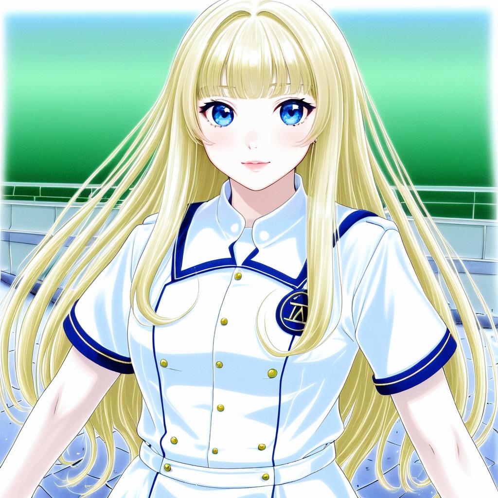 Digital anime-style illustration of a young woman with very long blonde hair and bright blue eyes, wearing a white Aria Company uniform with navy blue trim and gold buttons. The uniform features a sailor collar and short sleeves. Background includes a blurred outdoor setting with green and blue tones. Art inspired by the manga Aria.