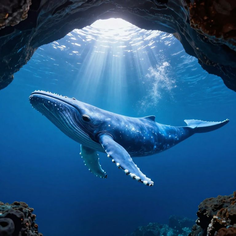 A majestic blue whale glides gracefully through a sunlit underwater cave, its translucent body shimmering with star-like speckles that pulse in sync with the ethereal light filtering through the rocky archway above, creating a serene and otherworldly digital artwork.