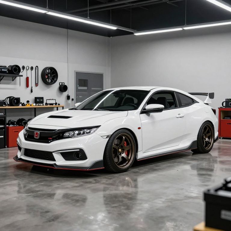 White JDM car showcased in a modern garage with polished concrete floor, surrounded by performance parts and tuning equipment, soft overhead lighting highlighting clean lines and sculpted body, custom rims and lowered suspension, high-resolution car photography style