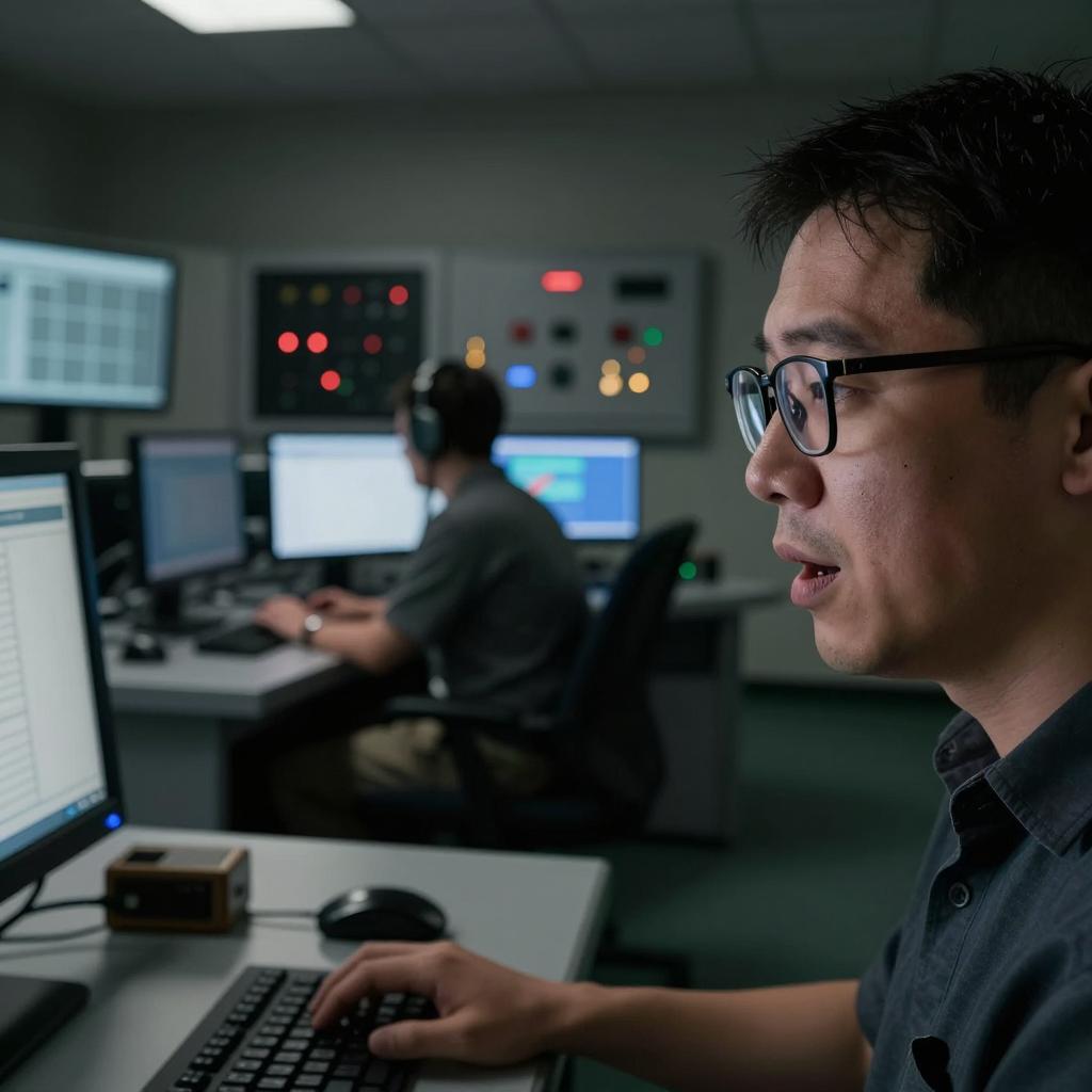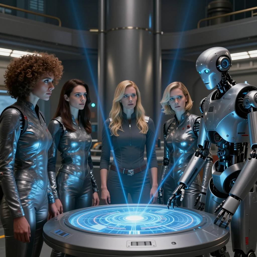 A dark, futuristic control room. Six people work at desks with monitors. Central woman with curly brown hair in red jacket stands, leaning forward. Others sit, focused on screens. Blue-tiled floor, metal railings, and dim overhead lights. Large screen on the right displays three faces. Desks with computers, papers, and chairs. Shiny, metallic ures. Blue lighting.