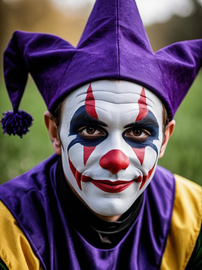 Smiling Man in Jester Costume with Face Paint