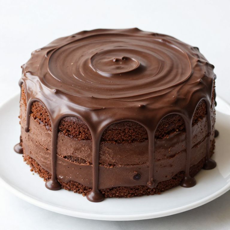 Photograph of a rich, round chocolate cake with multiple layers of moist chocolate sponge and creamy chocolate frosting. The cake is topped with a smooth, glossy layer of chocolate icing that has swirled in a circular pattern and drips down the sides, creating a visually appealing, decadent look. The cake sits on a simple white plate, which contrasts with the dark brown tones of the cake. The background is a plain white, making the cake the focal point. The texture of the cake appears dense and moist, while the frosting is smooth and slightly reflective.
