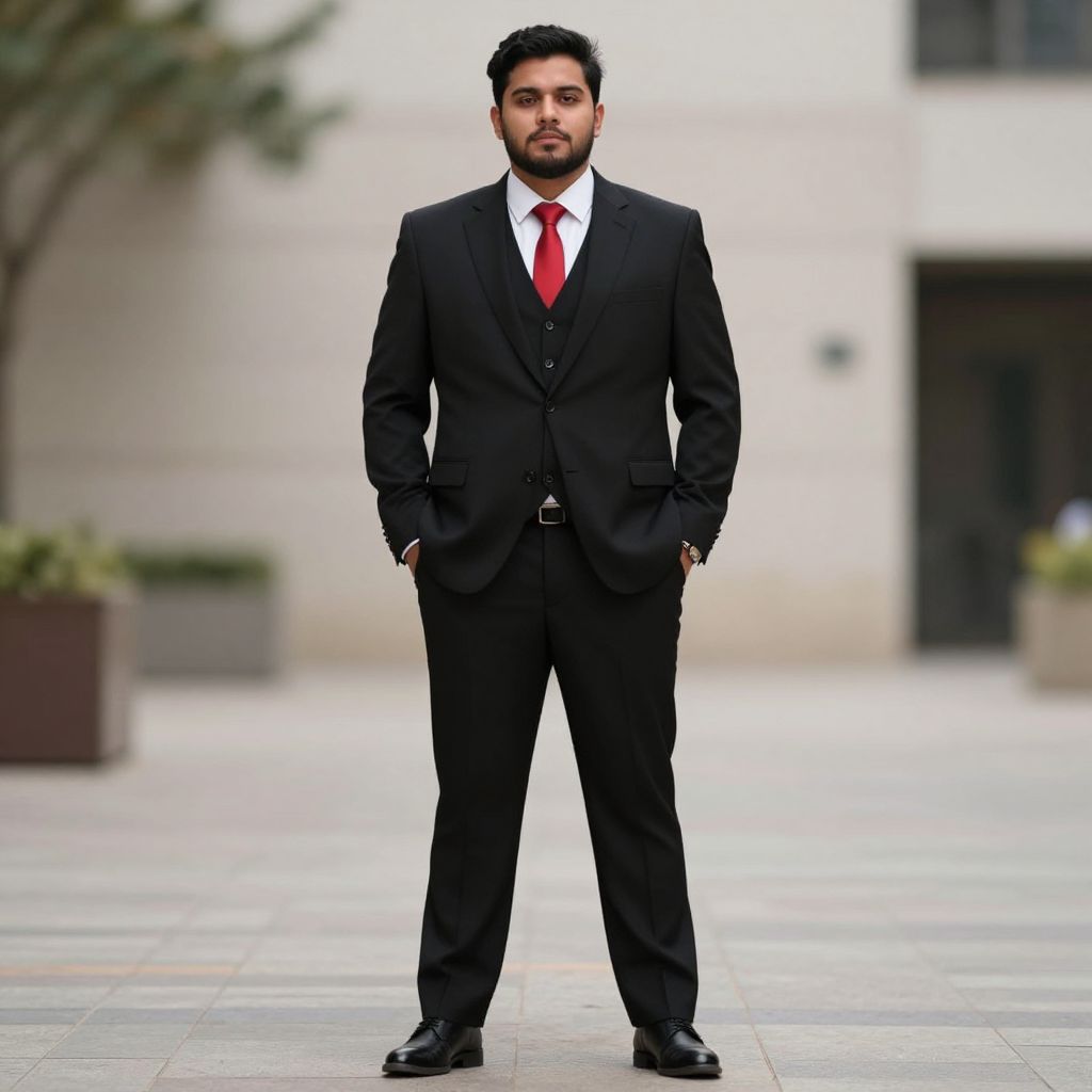 Photograph of a young South Asian man with short, curly black hair and a trimmed beard, standing confidently in an urban outdoor setting. He is dressed in a sharp, black three-piece suit with a white shirt and a bright red tie. His hands are casually placed in his pockets. The background shows a blurred, modern building with beige walls and a potted plant to the left. The ground is paved with light-colored tiles. His dark shoes are polished, and he exudes a professional and composed demeanor. The image is well-lit with natural daylight.