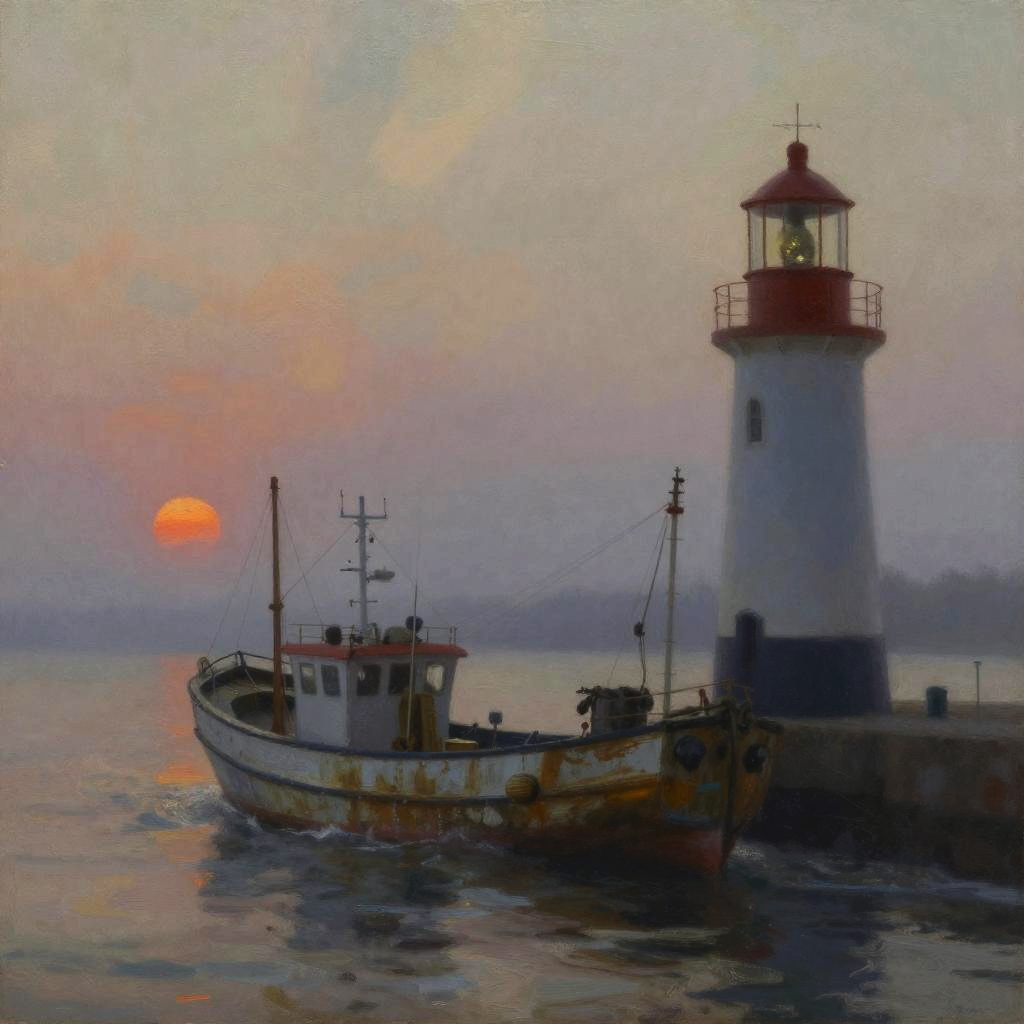 In a fog-blanketed coastal lighthouse, a weathered fishing schooner sails gracefully across the horizon, as the sun sets, casting a warm glow over the water, captured in a moody cinematic oil painting.