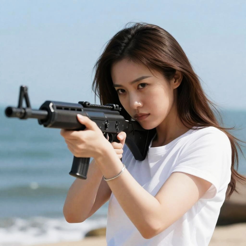Photograph of a woman with long brown hair, wearing a white t-shirt and silver bracelet, holding a large black rifle with both hands. She is aiming forward with a determined expression. Ocean and sky in the background. Bright sunlight.