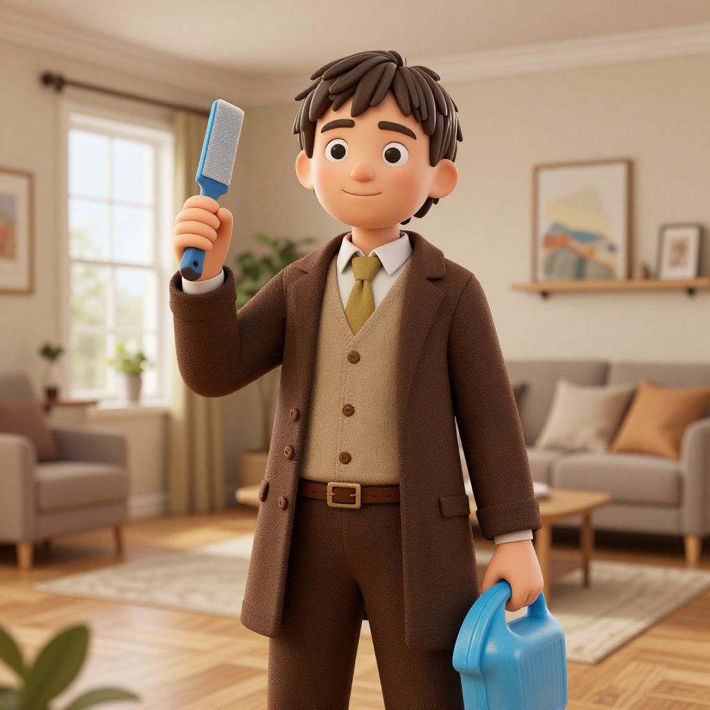 3D cartoon man in brown suit, yellow tie, holding blue comb and briefcase, standing in bright living room with furniture.