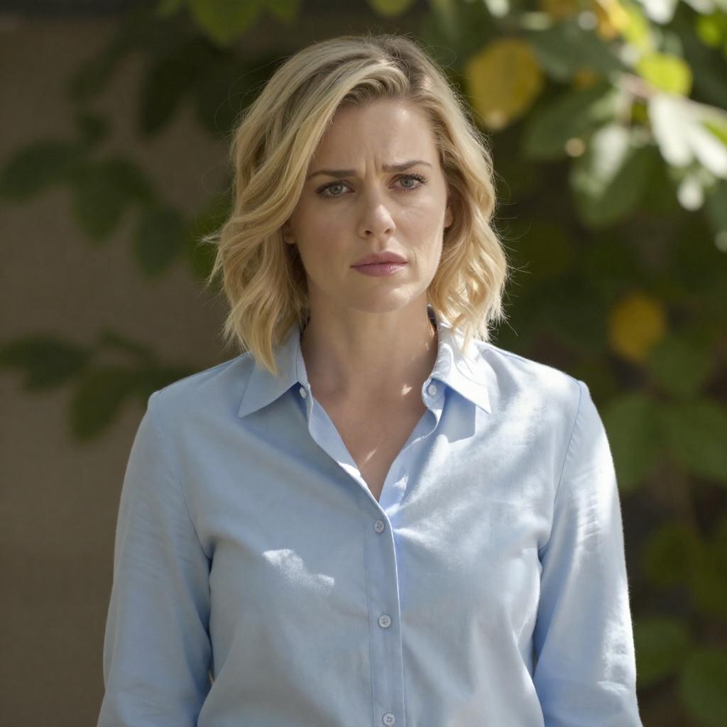Portrait of a blonde woman with fair skin wearing a brown leather jacket and a blue patterned scarf. She stands with her hands in her pockets, sporting a serious and intense expression. The background is bright and out of focus, with a blurred figure in the foreground.