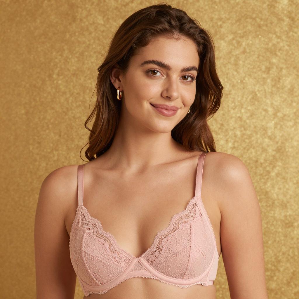 Photograph of a young woman with light skin and brown hair, wearing a light pink, lace-trimmed bra. She has a slight smile, brown eyes, and wears small gold hoop earrings. The background is a golden, glittery ure. She is facing slightly to the right, with her head turned towards the camera. Her shoulders are relaxed.