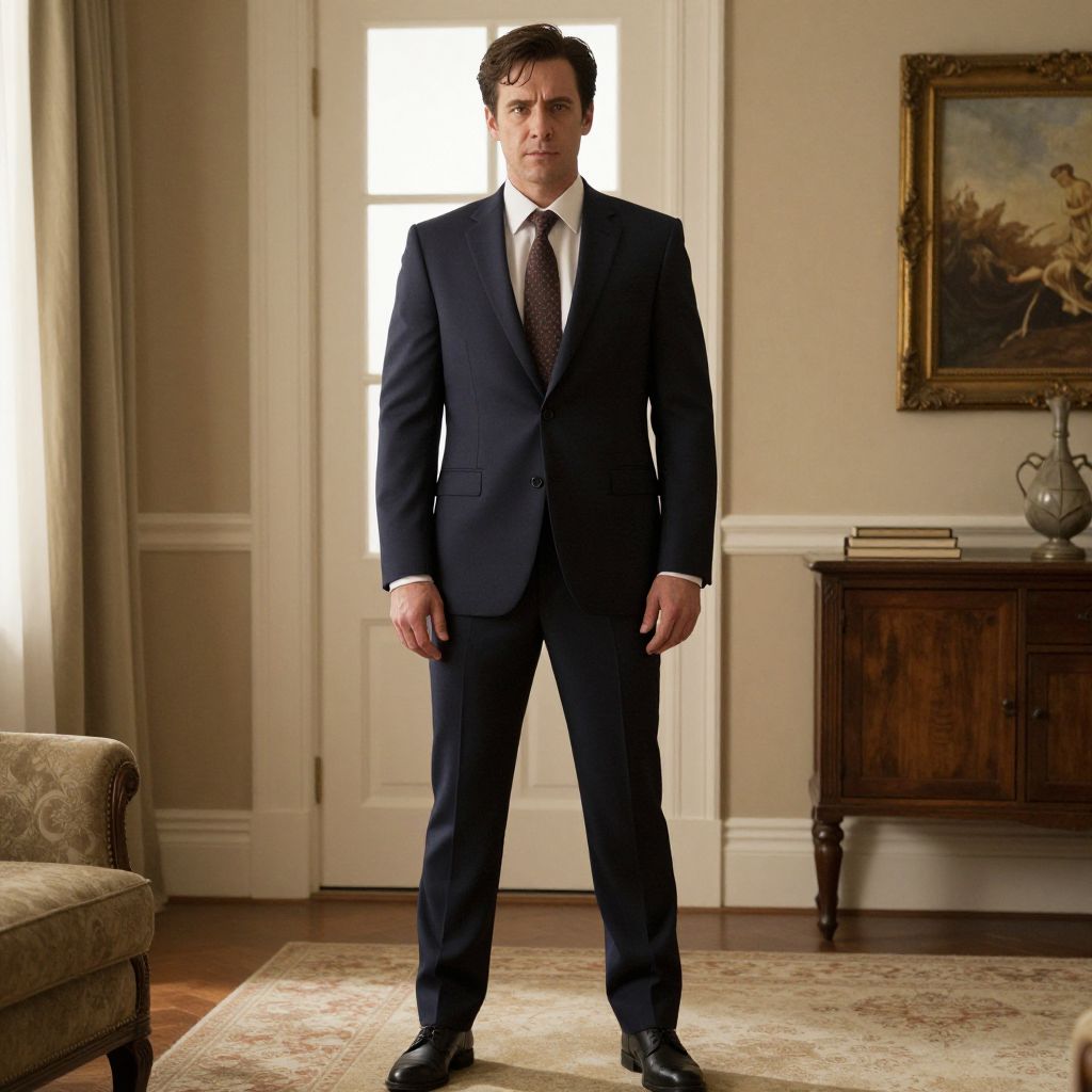 Photograph of a serious, dark-haired man in a black suit and tie standing in a classic, well-lit living room.