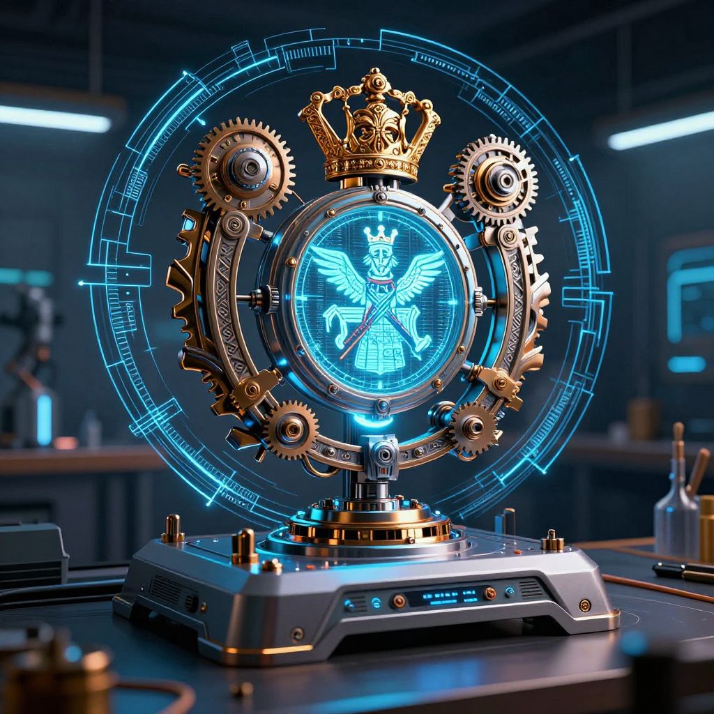 Crest generator design concept, a futuristic machine producing ornate family crests with glowing digital elements, intricate heraldic symbols, metallic gears, and swirling blueprints, set against a dark workshop background with neon highlights, cyberpunk art style.