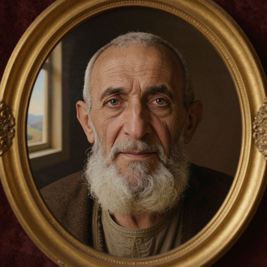 This photograph features an elderly man with a weathered face, characterized by deep wrinkles and a thoughtful expression. He has white, curly hair and a full, white beard that matches his hair. His light brown eyes are slightly squinted, adding to his wise appearance. He is wearing a brown, textured jacket over a beige shirt. The man is framed within an ornate, oval-shaped, golden picture frame with floral patterns at the top and bottom. The background is dark, with a small window on the left side allowing light to cast a gentle glow on his face.