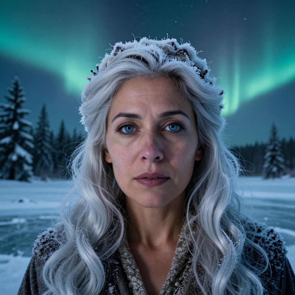 Photograph of a white-haired woman with blue eyes, frost-covered hair, and winter cloak, standing in a snowy landscape with aurora borealis.