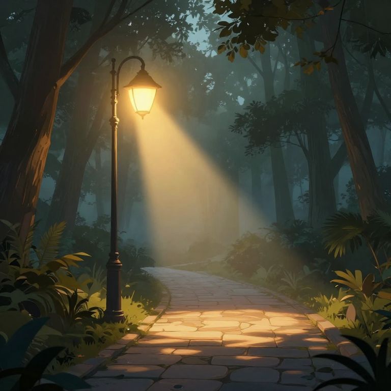 A computer-generated, high-definition illustration depicts a vintage-style streetlamp casting warm, golden beams of light through a misty forest, illuminating a stone-paved path and creating concentric patterns of light and shadow on the surrounding foliage, evoking a serene yet mysterious atmosphere.