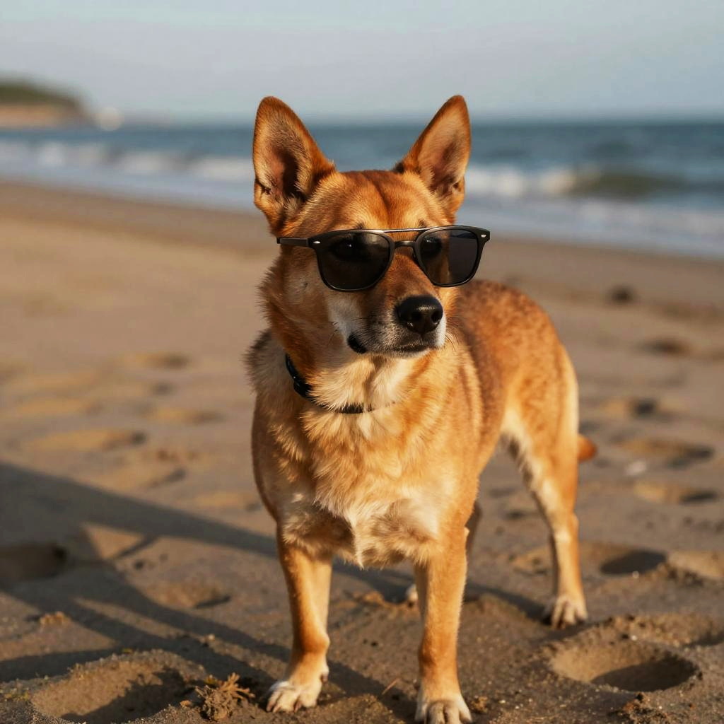 85mm, f1.8, portrait a dog on a beach wearing sunglasses, photo realistic, hyperrealistic, orante, super detailed, intricate, dramatic, sunset lighting, shadows, high dynamic range