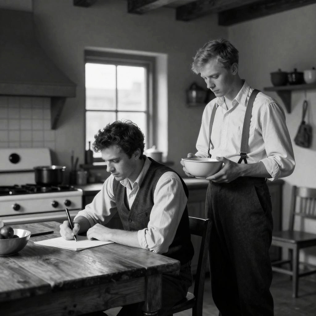 Photograph of two men sitting in front of a steam engine. Left man has curly hair, unbuttoned shirt, hand on head. Right man has gray hair, brown jacket, intense expression. Dense green forest in background. Both men look tired. Steam engine parts visible behind them.