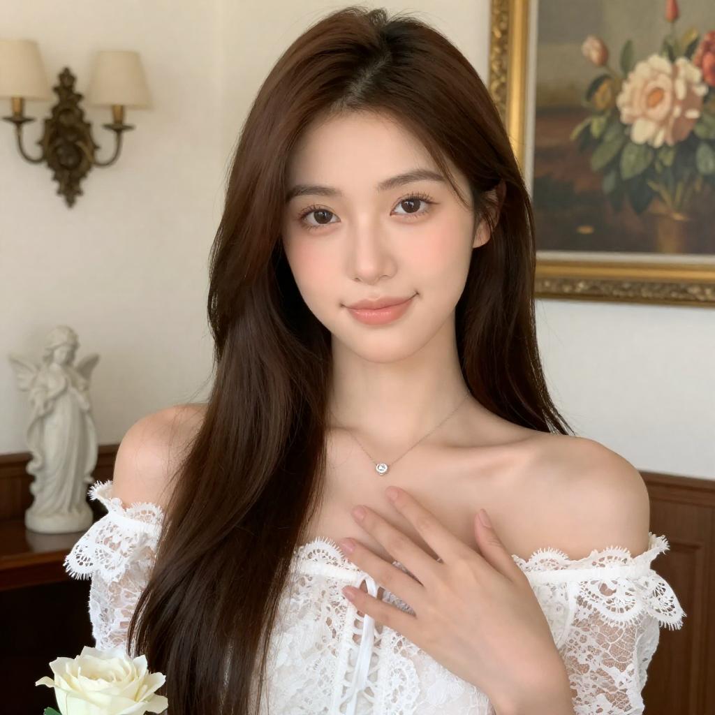 Photograph of a young woman with long, straight brown hair and fair skin, wearing a white lace off-shoulder top. She has a delicate necklace and a gentle smile, with her right hand resting on her chest. The background features a blurred wall sconce, a statue, and a floral painting. A white flower is in the foreground.