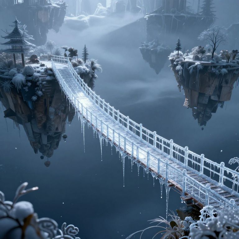 Fantasy CGI image of a glowing, icy suspension bridge connecting two snow-covered, floating islands in a foggy, moonlit forest.