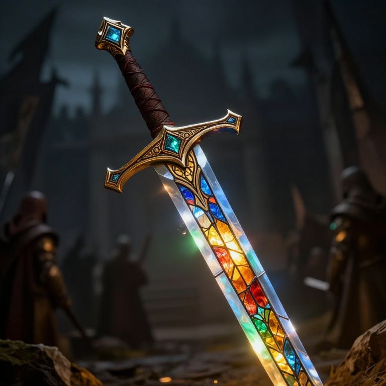 Epic stained glass sword with ornate handle, luminous glass fragments, radiant colors blending, fantasy warrior theme, medieval battleground background, high contrast lighting, dramatic scene