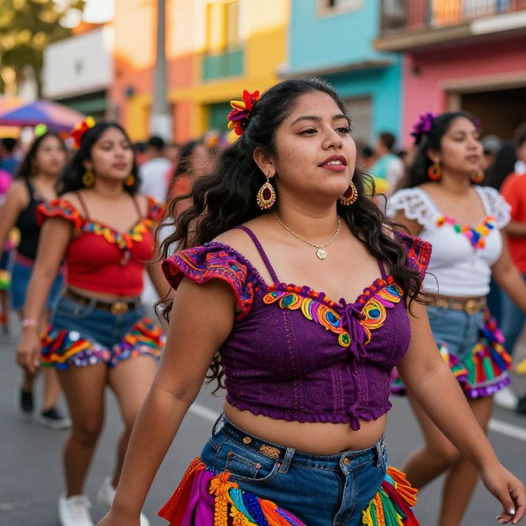 Photograph of Latina women in vibrant, traditional Mexican attire with colorful embroidery and flower accessories, dancing in a lively street parade.