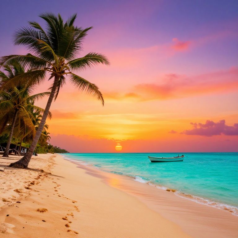 Photograph of a vibrant tropical beach at sunset, featuring golden sand, turquoise water, palm trees, and a small boat near the horizon.