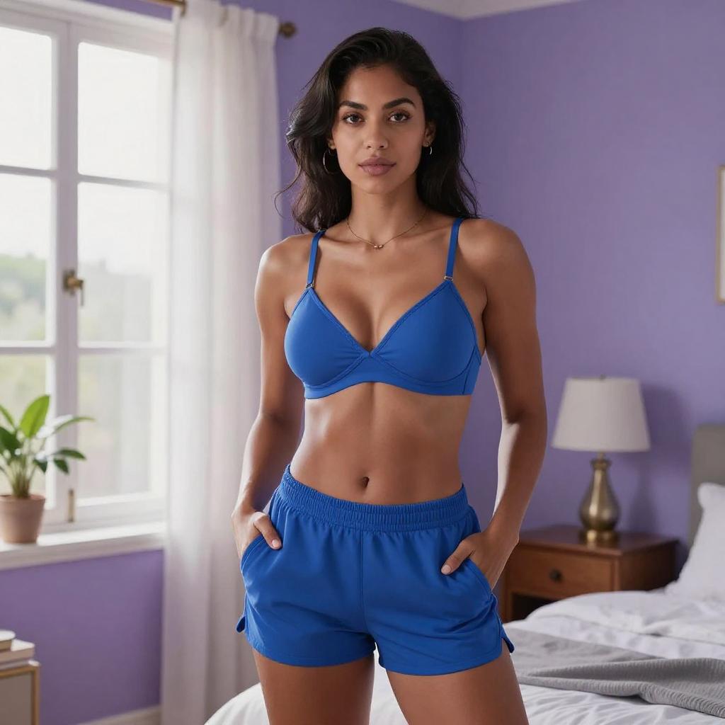 A buff woman stands confidently in a park setting, showcasing her athletic physique in coordinated fitness attire. The image has a vibrant, retro feel reminiscent of Kodachrome analog film.