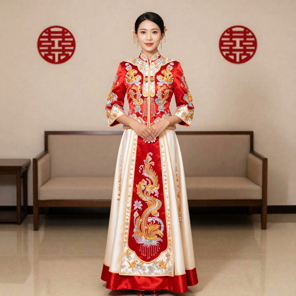 Traditional Cantonese Wedding Dress, a woman in a red and white dress standing in a room