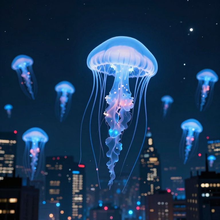 Photograph of a night cityscape with glowing blue jellyfish illuminated against a dark, starry sky. The jellyfish, with translucent, umbrella-shaped tops and trailing tentacles, are scattered throughout the scene. The background features a silhouette of a city with brightly lit skyscrapers and neon lights, creating a contrast between the natural and urban environments. The jellyfish are centrally focused, with several smaller ones blurred in the background, adding depth to the image. The overall color palette includes deep blues, bright whites, and occasional red and yellow lights from the city.