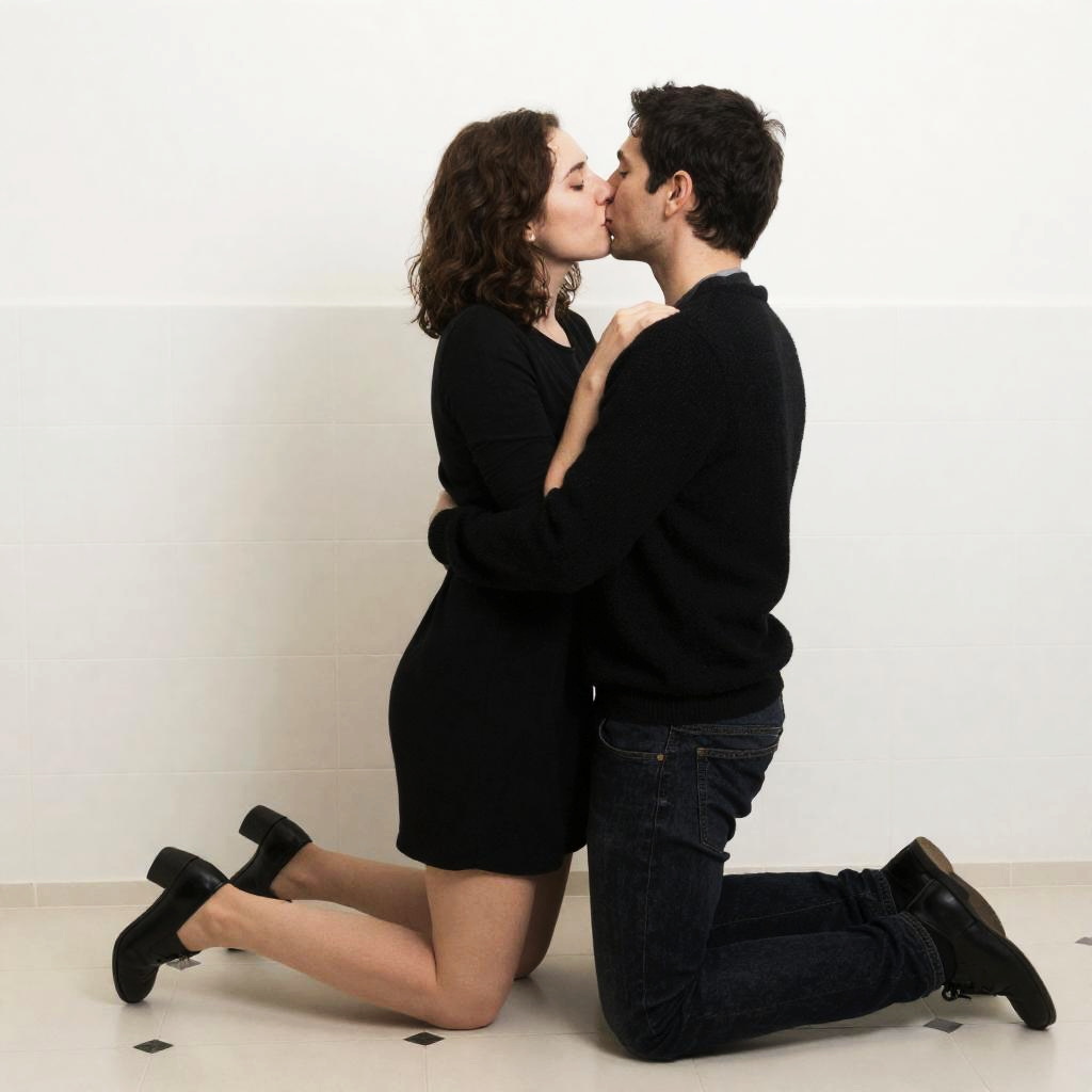 Two people kissing passionately in a tiled room. The man kneels, wearing a black sweater and jeans, holding the woman who wears a black dress and black shoes. White walls and tiled floor with small black dots. Woman's eyes closed, man's face obscured. Both have short hair. Man's back to the viewer, woman's front.