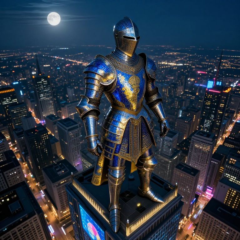 Craft an image that merges Renaissance art with cyberpunk aesthetics, portraying a futuristic knight wearing a suit of armor embellished in vivid blue and gold shades reminiscent of Florentine mosaics. This knight is positioned on top of a towering skyscraper illuminated by neon lights, overlooking a sprawling cityscape under the moonlit night sky. Capture this scene from an aerial perspective, similar to a drone's view, showcasing both the awe-inspiring grandeur and futuristic dystopia, instilling within the viewer a spectrum of emotions ranging from wonder to uncertainty.