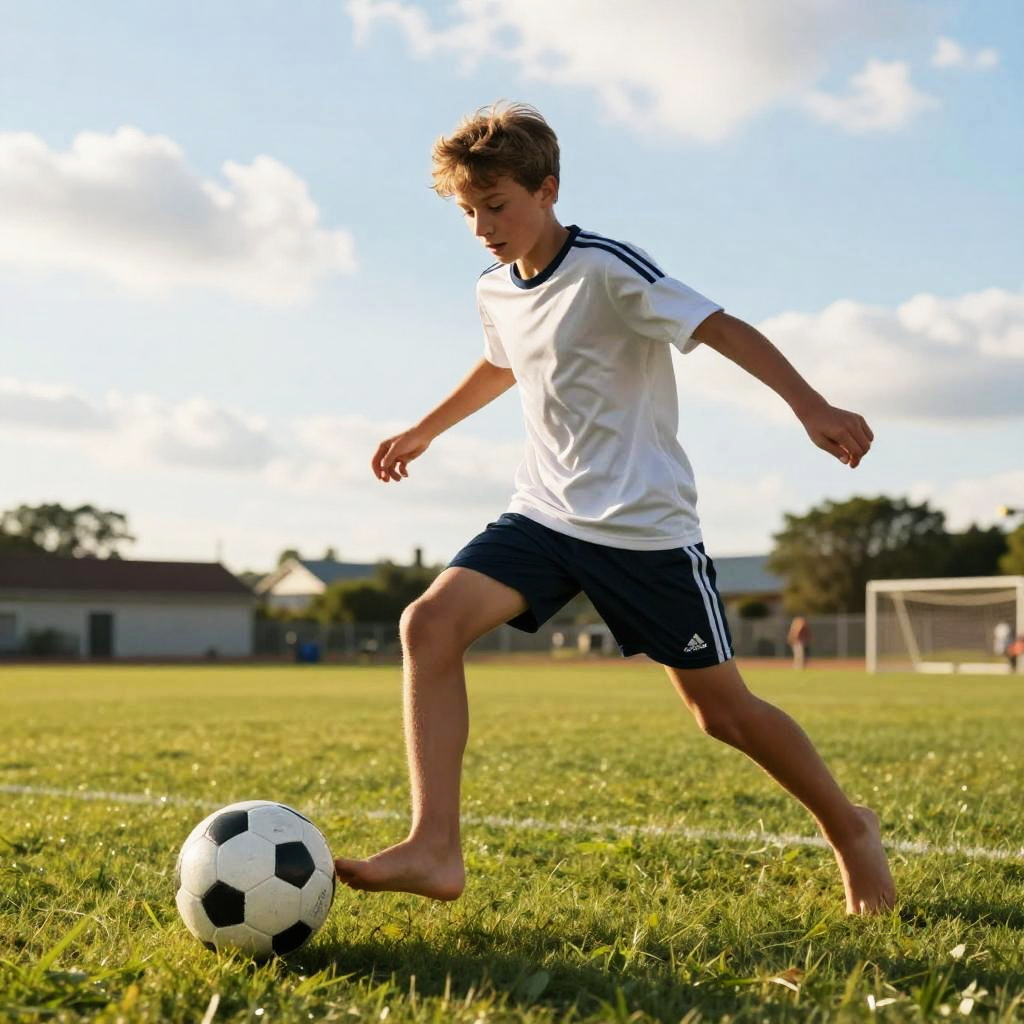 Barefoot teen boy playing soccer on a grassy field during golden hour, dynamic action pose with focused expression, bright green grass and blue sky with fluffy clouds, casual sportswear, energetic and lively scene full of movement and youthful energy.