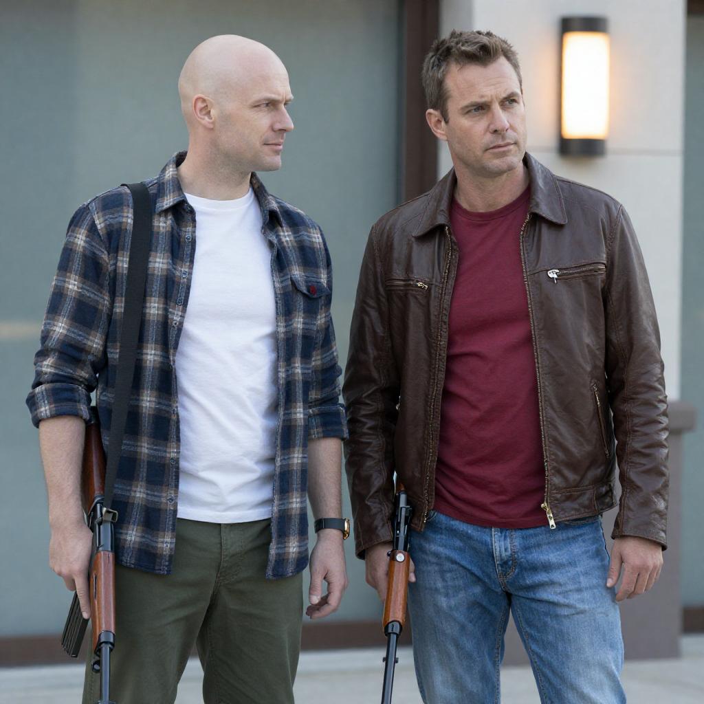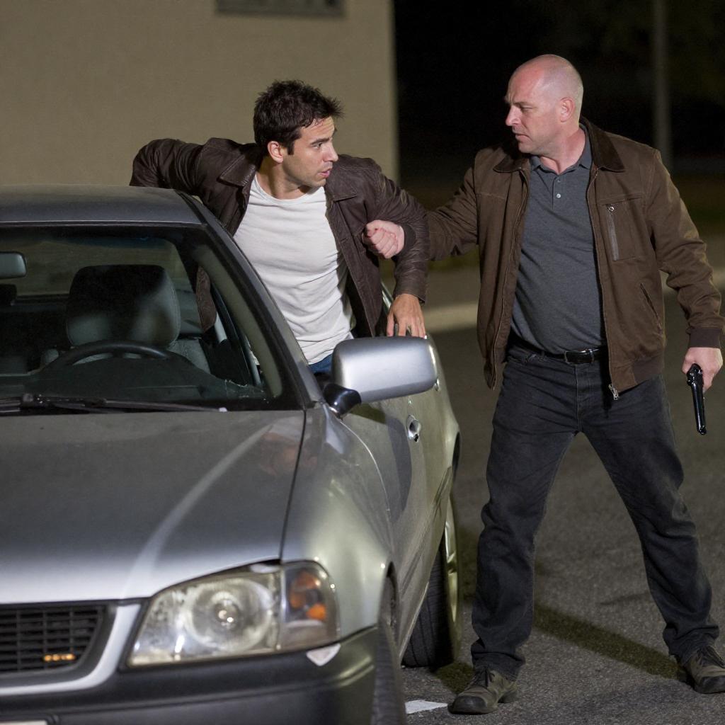 Photograph of two men at night. Bald man in brown jacket and gray shirt, holding gun, pulls man in brown jacket and white shirt out of crashed, severely damaged car. Car's front is crumpled, windshield broken. Street and building in background. Intense expressions.