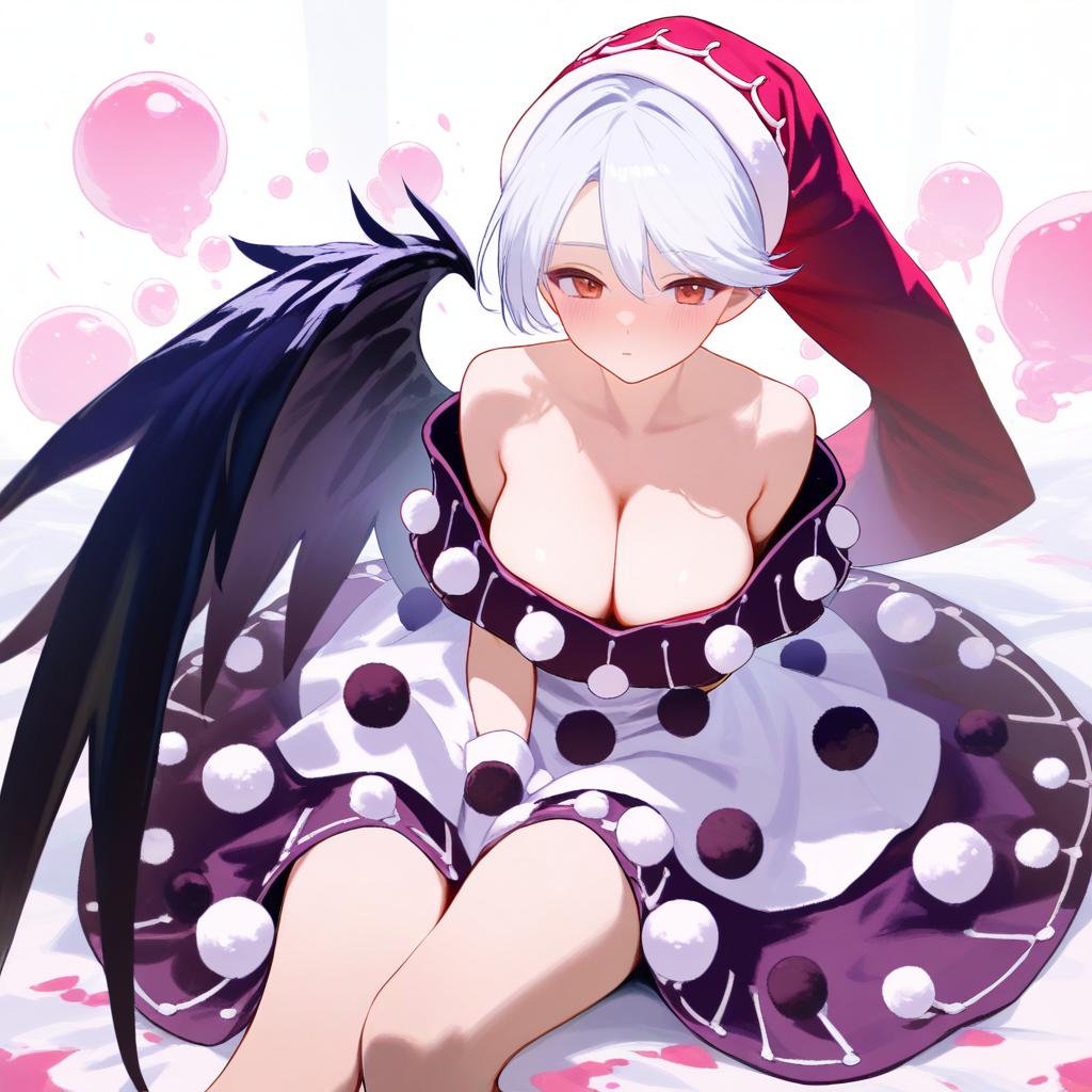 Doremy_sweet,1girl,,solo,red eyes,wings,purple dress,dress,hair ornament,single wing,covering privates,covering ,cleavage,large ,bare shoulders,blush,white hair,short hair,long sleeves
