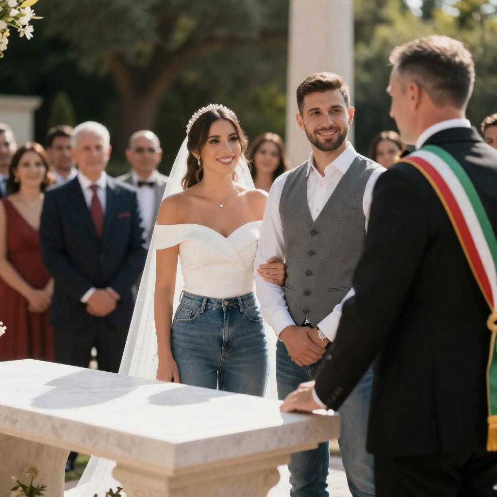 Photograph of a group of five people at an outdoor event. A man in a light purple suit stands beside an older man in a black tuxedo with a white shirt. A woman in a white wedding dress with long brown hair stands to the left. Two other men in white suits are on the right. Background includes beige buildings with black railings and blue balloons. Bright sunlight casts strong shadows.