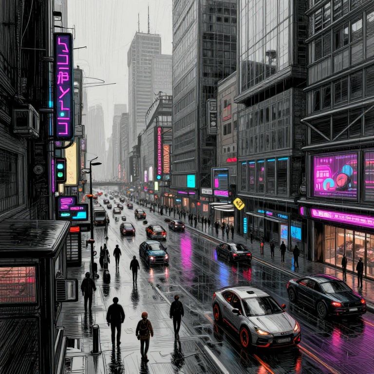 Drawing:teufatn7fla= cyberpunk urban scene drawn in a gritty, sketch-like style, detailed architectural elements with neon highlights and rain reflections, bustling streets filled with futuristic vehicles and characters, combining hand-drawn textures with digital effects