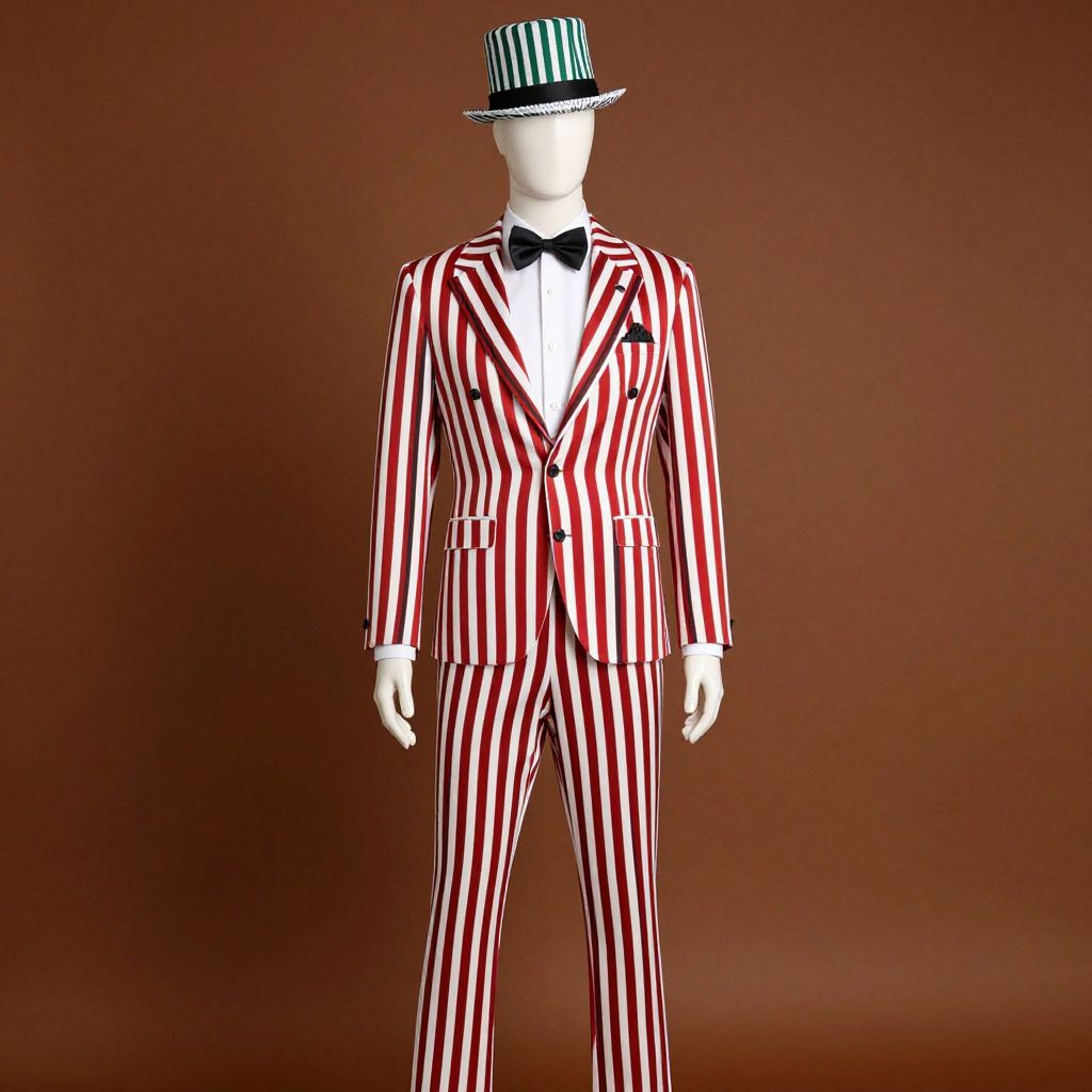 A mannequin wearing a red and white striped outfit with black and red stripes and a black bow tie, standing in front of a brown background. The mannequin is tall and slender, with a confident posture and a sophisticated demeanor. The outfit is designed to be both stylish and vintage, with the red and white stripes adding a bold contrast to the black and red elements. The black bow tie is neatly tied, and the top hat with green and white stripes adds a touch of elegance. The mannequin's expression is serious and focused, exuding a sense of authority and professionalism. The brown background provides a neutral and professional setting, highlighting the mannequin's attire and overall appearance.